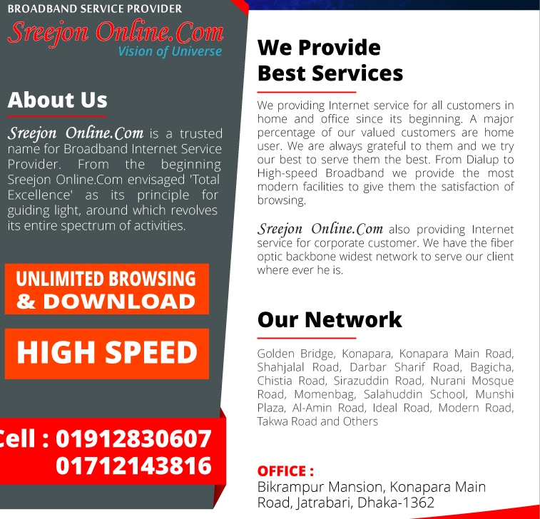 Our types of services make us unique in the Broadband Internet Service Provider market in Jatrabari/Demra. We are confident and honest in saying that the services of Sreejon Online.com can provide cannot be provided by any other Broadband Internet Service provider company in Jatrabari/Demra. We have both Unlimited Download & Voice Chat Facility (24 Hour).